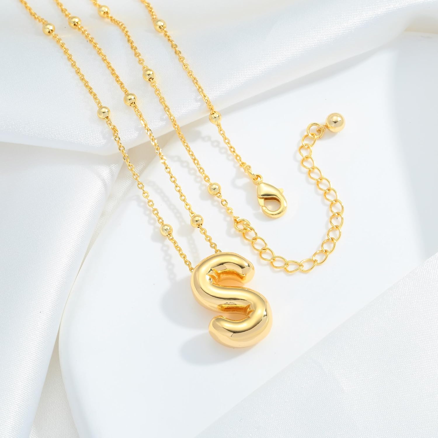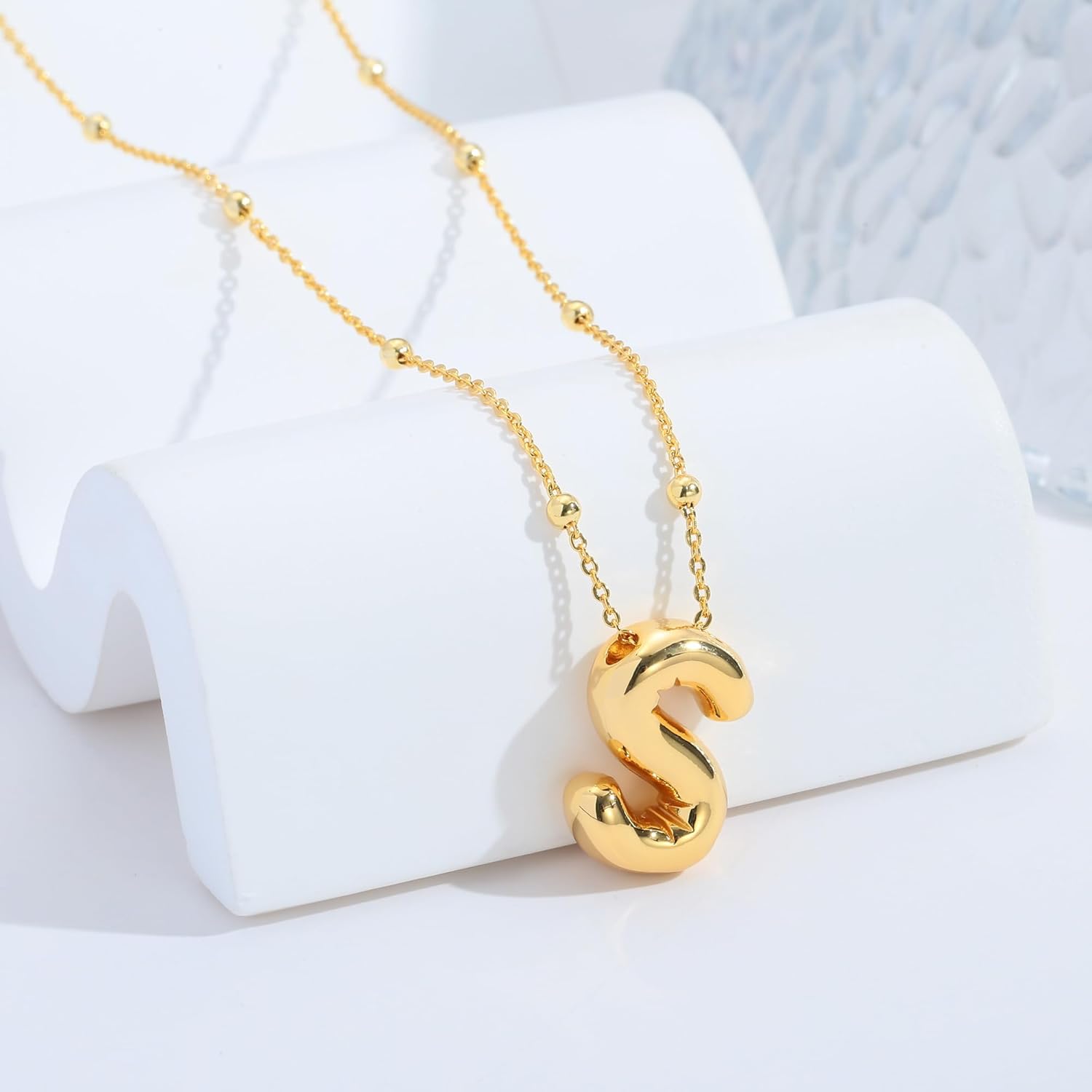 Gold Initial Bubble 3D Letter Necklace for Women with Beaded Satellite Chain Charm Simple Jewelry Gift